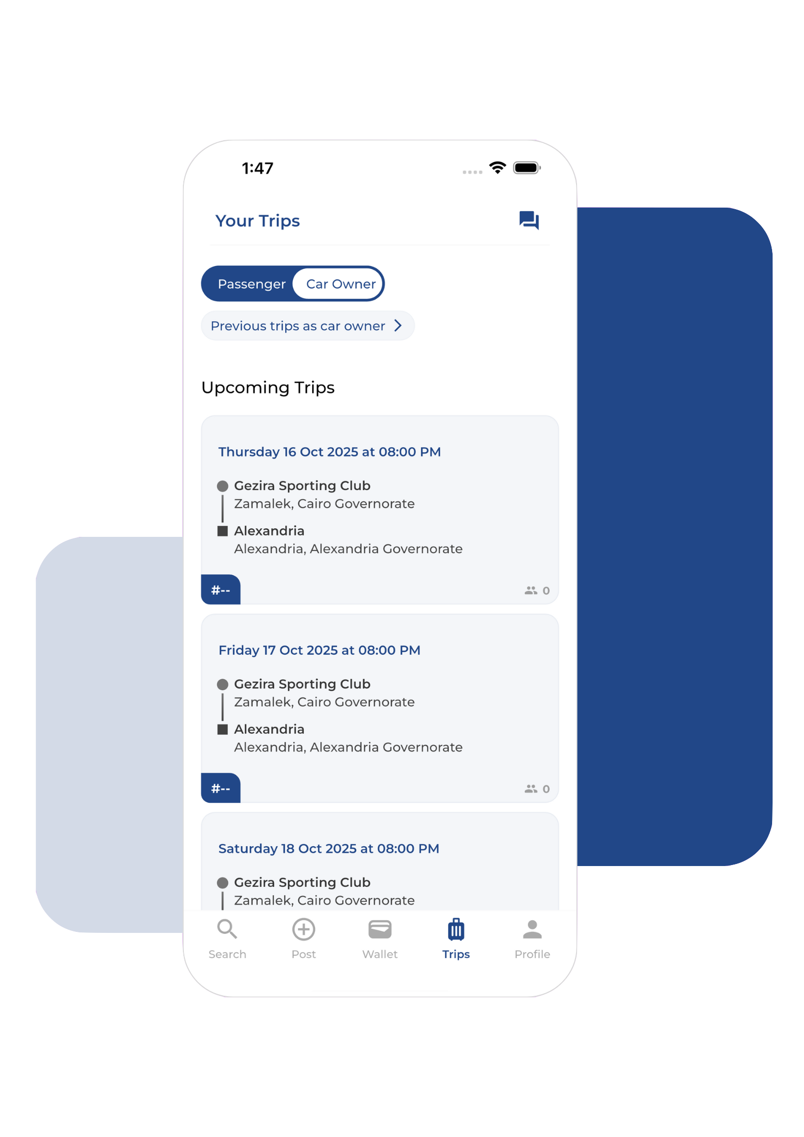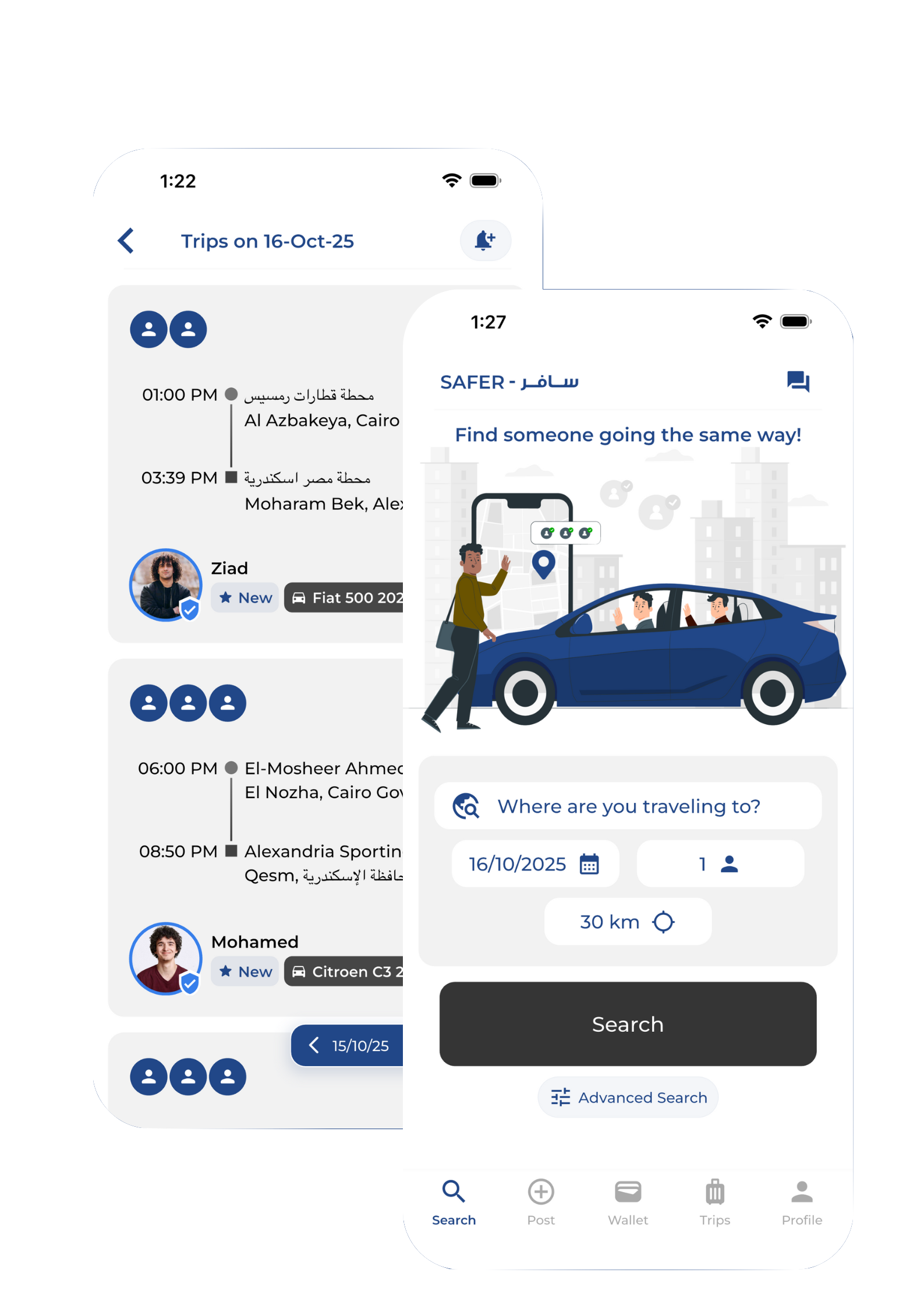 ندعوك لتكون جزءًا من مجتمع سافر. سواءً كنت مالك سيارة ترغب في مشاركة رحلتك أو راكبًا يبحث عن خيار سفر مريح، فإن سافر هنا لجعل رحلتك أفضل. معًا، يمكننا إعادة تعريف السفر بين المدن وجعله أكثر أمانًا وصداقة للبيئة ومتعة.