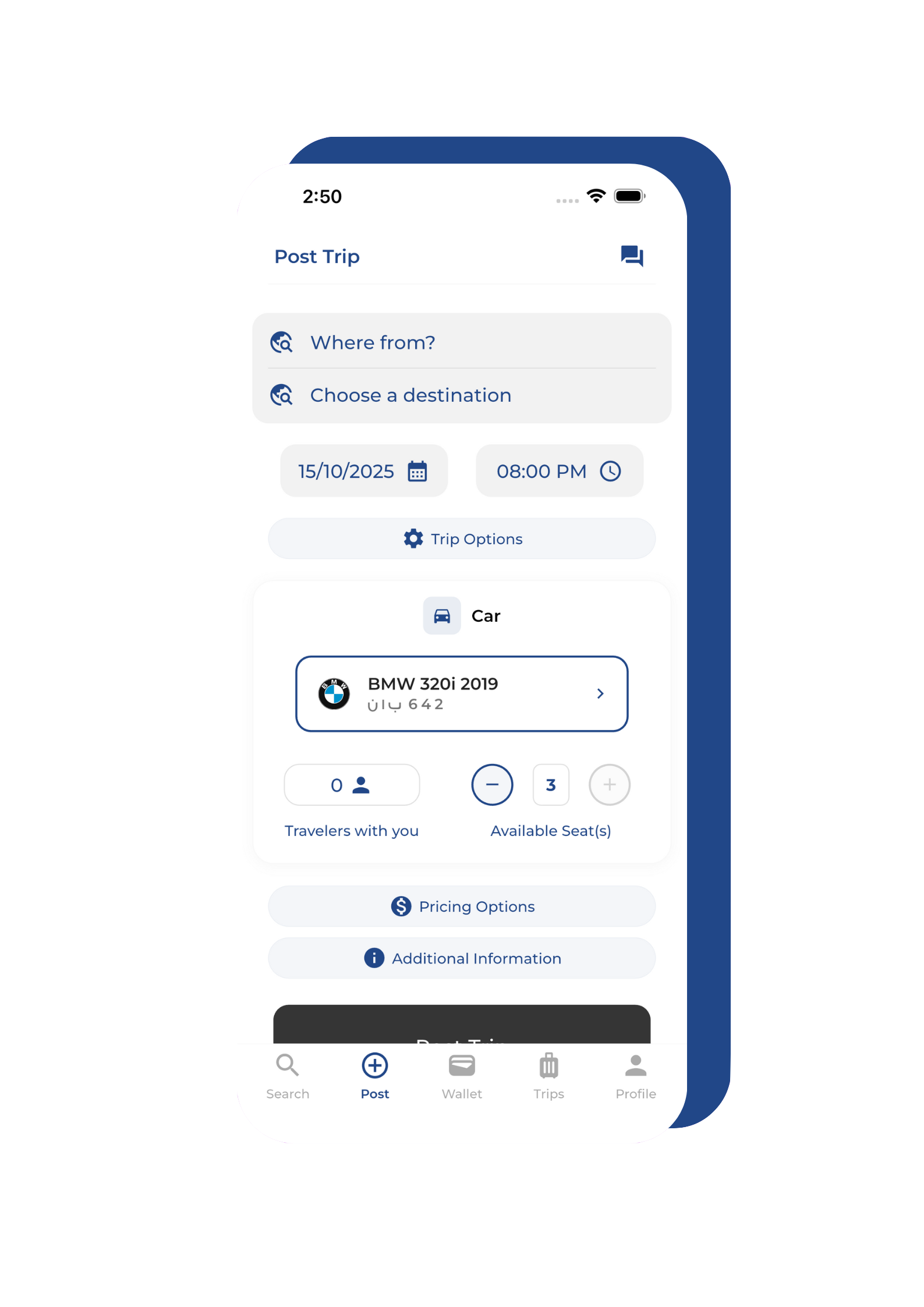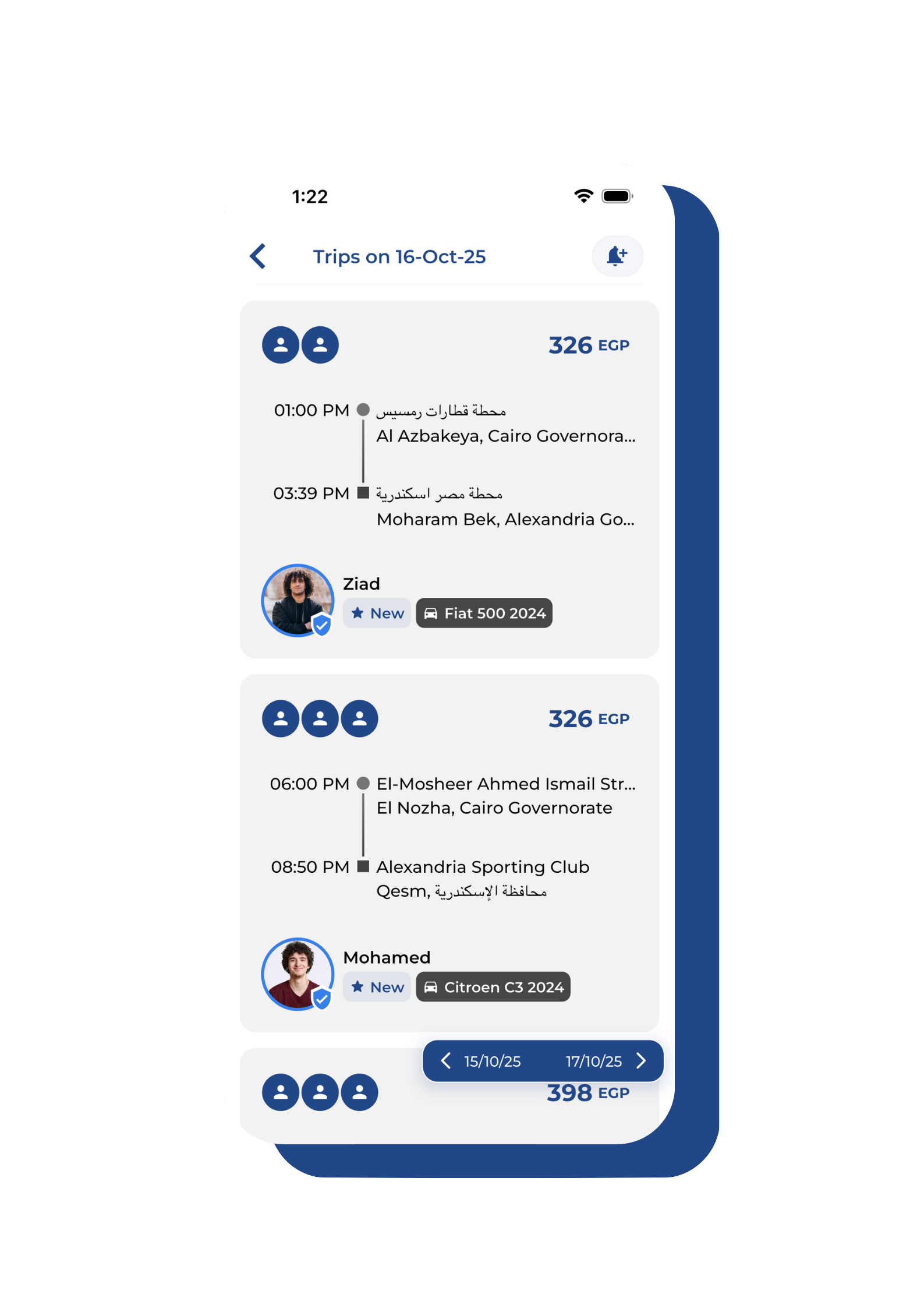 سافر: اجعل كل رحلة أفضل ستجد رحلتك المثالية على الفور هل تبحث عن رفيق سفر؟ استخدم بحثنا السلس للعثور على رحلات تناسب جدولك وتفضيلاتك. أسعار في المتناول خيارات متعددة للرحلات راحة كن مضيفًا: انشر رحلتك في ثوانٍ! هل لديك مقاعد فارغة؟ شارك رحلتك! ما عليك سوى تحديد مسارك ووقتك وتفضيلاتك بكل سهولة وابدأ في التواصل مع مسافرين يشاركونك نفس الوجهة. مرونة كاملة سفر بتكاليف أقل فرص لتحقيق دخل من رحلاتك ادفع بأمان وسهولة لا تحمل نقود؟ لا مشكلة. ادفع أو استلم مدفوعاتك عبر نظام الدفع الآمن داخل التطبيق. تجنب الدفع نقدًا طرق دفع متعددة سحب التعويض بسهولة تواصل بكل سهولة تعرّف على رفاق سفرك وتأكد من تفاصيل الرحلة عبر ميزة الدردشة الآمنة داخل التطبيق. تنسيق أفضل دردشات جماعية لا حاجة لتبادل بيانات الاتصال الثقة من خلال الشفافية تحقق من تقييمات ومراجعات المسافرين الآخرين قبل الحجز واترك تعليقاتك لتحسين تجربة الآخرين. تقييمات موثوقة ثقة نابعة من المجتمع ملفات شخصية شاملة